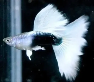 Elegant and simple, the White Tuxedo Guppy shows a snowy white body with dark tuxedo shading on its tail. Its clean appearance makes it a stylish addition to aquariums with contrasting colorful strains.